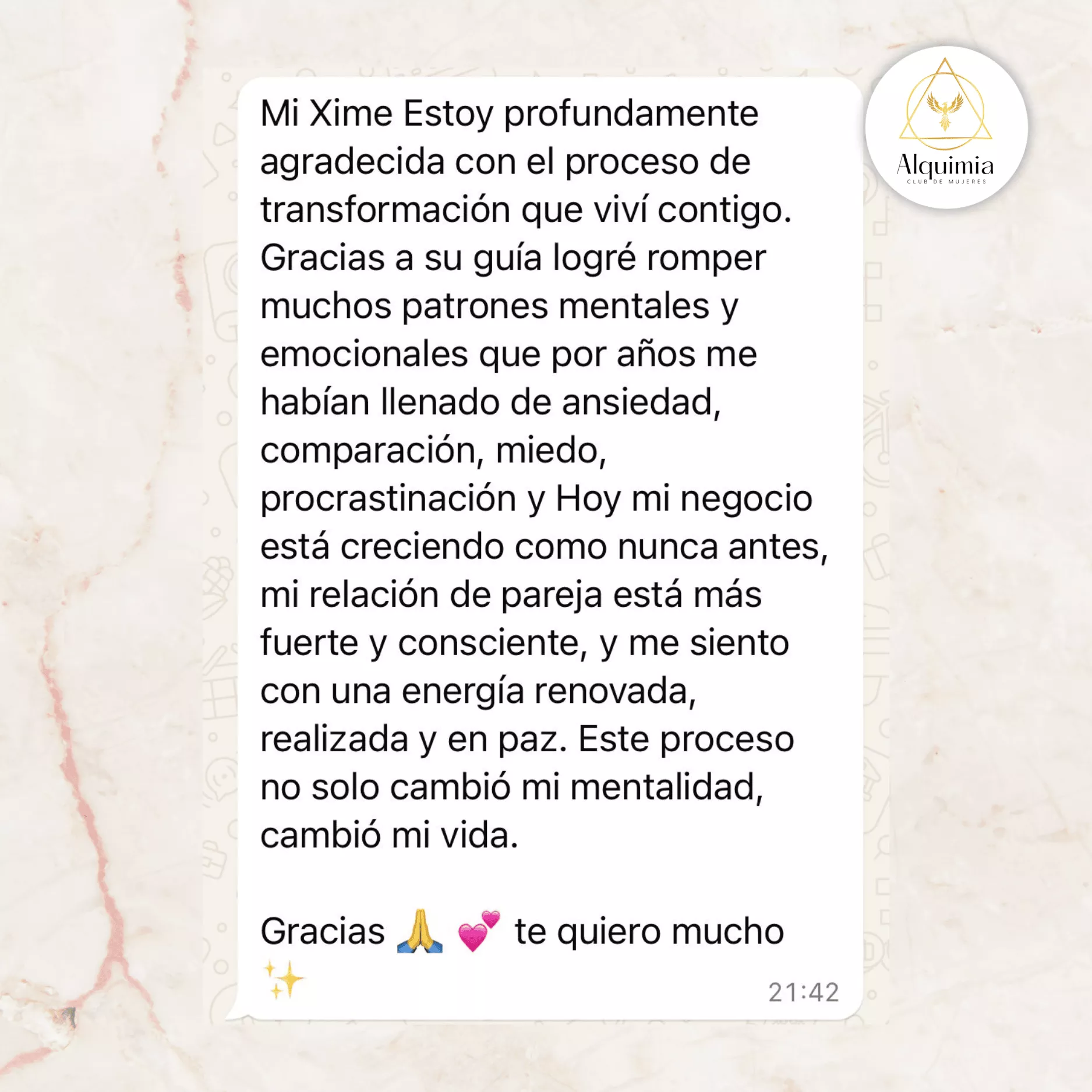 Los últimos años, Ximena ha acompañado a cientos de mujeres en procesos profundos de sanación, empoderamiento y reconexión con su propósito. Su propia transformación —como mujer, madre y alma en expansión— la llevó a canalizar y estructurar su metodología única: El Camino de la Mujer Alquimista.