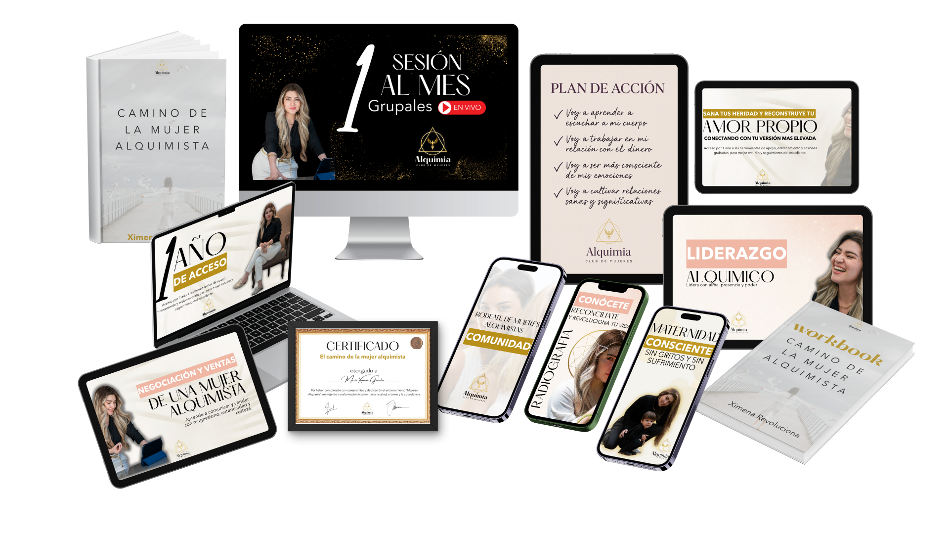 > Acceso completo por 1 año a la metodología Alquimia y a las sesiones en vivo, donde transformarás de raíz tu mente, cuerpo, dinero, negocios, propósito, relaciones y espiritualidad.